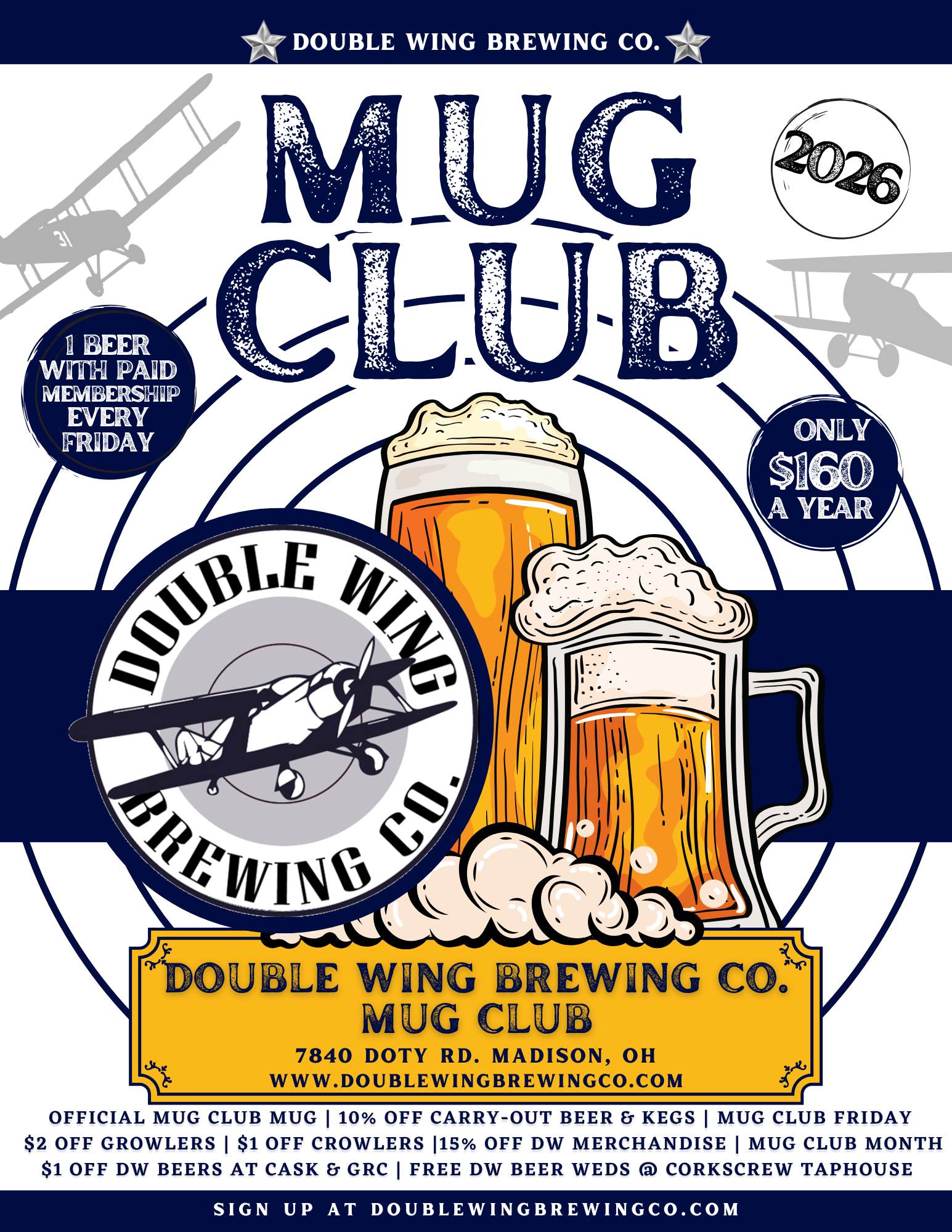 Membership includes an official Double Wing Brewing Co. Mug Club mug, "Welcome to the Club" launch party, "Mug Club Fridays" including 1 FREE draft beer at Double Wing Brewing Co. (Debonné Vineyards) every Friday, !!NEW!! 1 FREE Double Wing Brewing Co. draft beer at Corkscrew Taphouse on Wednesdays, $2 off growler fills, $1 off crowlers, 10% off Carry-Out Beer (cans) & kegs, 15% off merchandise, February Mug Club Month Promo, $1 off Double Wing beers at Cask 307 & Grand River Cellars, Quarterly Members-Only Events and more! Membership package will be mailed to the Delivery Address listed at check-out or can be held for pickup at Double Wing Brewing Co.