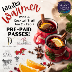 TRAIL DETAILS: Baby, it's cold outside! Come warm up with the members of The Valley Wine Group on a trail dedicated to warming comfort foods and cozy wines & cocktails! At Grand River Cellars, Debonné Vineyards, Cask 307, South River Vineyard, Red Eagle Distillery, Black Door Tavern & (NEW!) Corkscrew Taphouse, enjoy 2 wine samples (mini-cocktails at Red Eagle and Black Door) and a comfort-food appetizer.